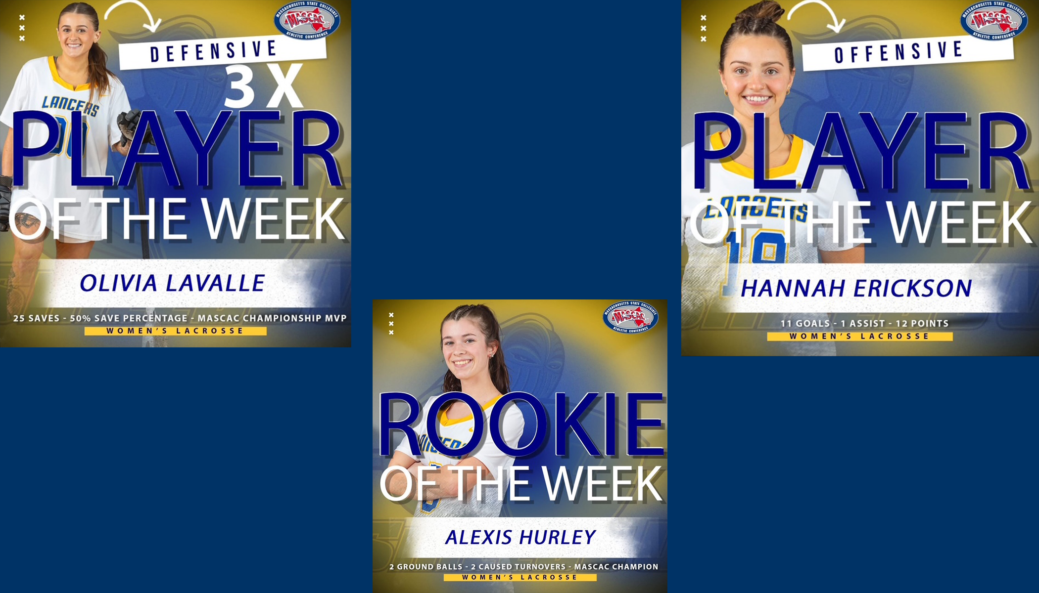 May 05, 2025Worcester, MA- After claiming their first conference championship in program history, the Worcester State Women’s Lacrosse team had three named to the MASCAC weekly honors. Seniors Hannah Erickson (Dunstable, MA) and Olivia LaValle (Peabody, MA) along with first year Alexis Hurley (Feeding Hills, MA) took home the recognition. -